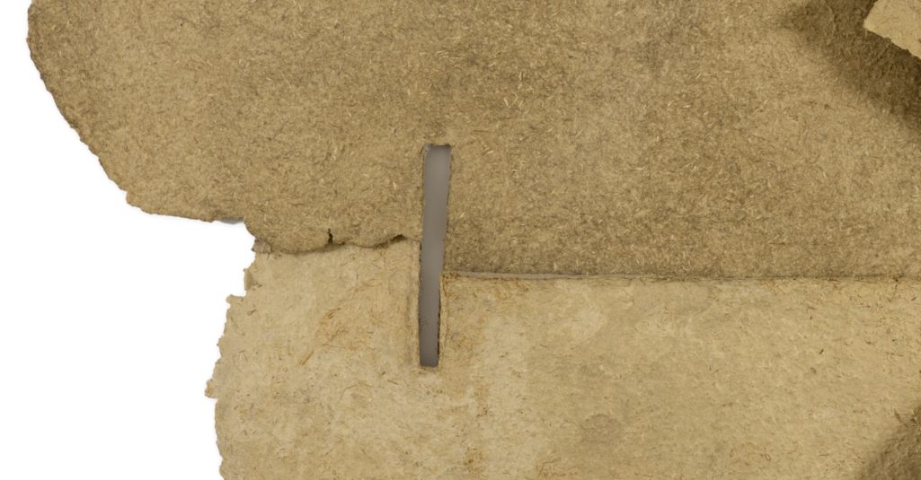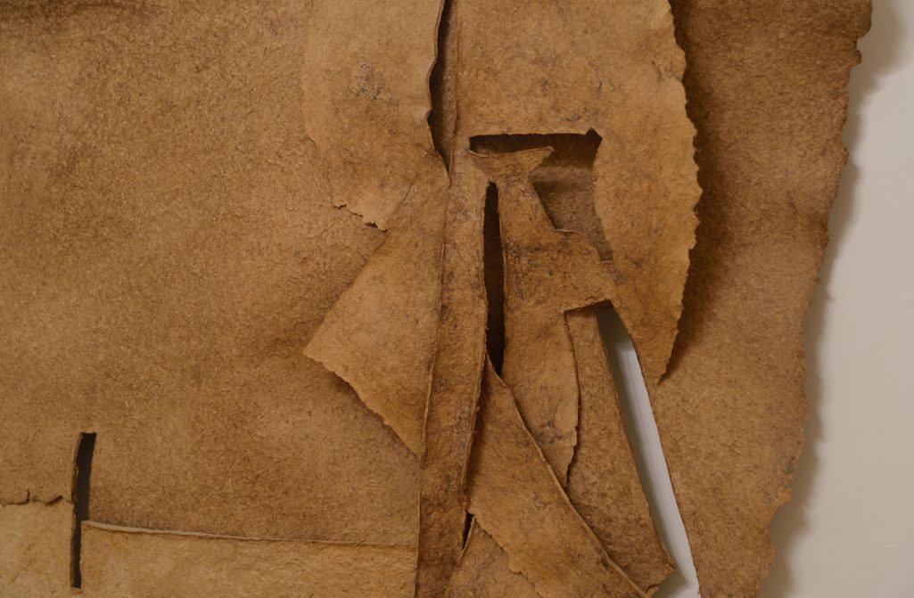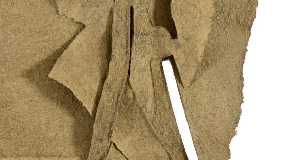 Überwurf, 1990, Collage und Faltung, Karton, Packseide, Acrylfarbe, Viskosefasern, Eisenoxid; 74 x 94 cm
