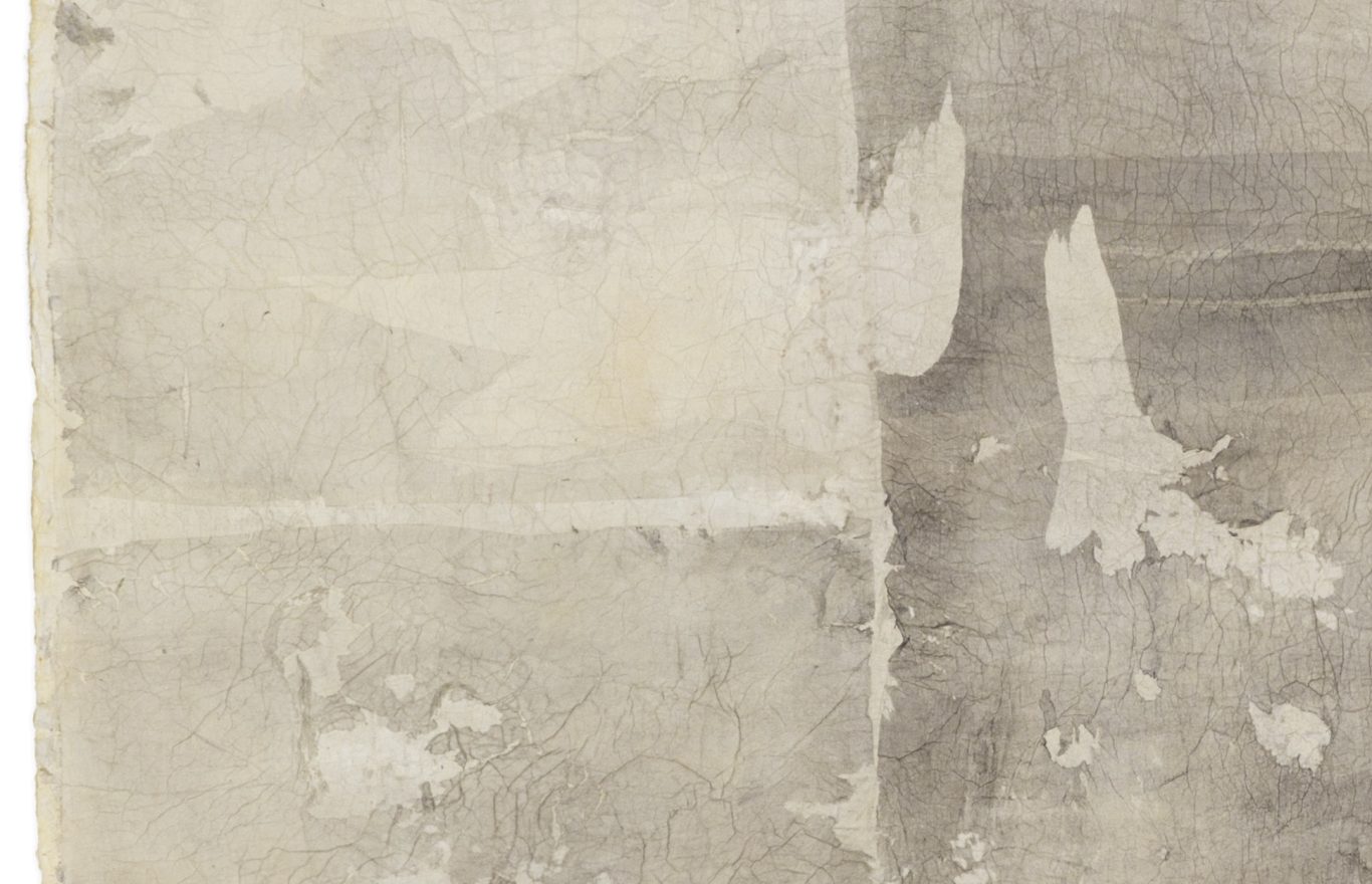 Flugbild II, 1990, Collage, Packseide Baumwolle, Viskosefasern, collagiert, diverse Aschen, Hausstaub, Eisenoxid; 110 x 150 cm